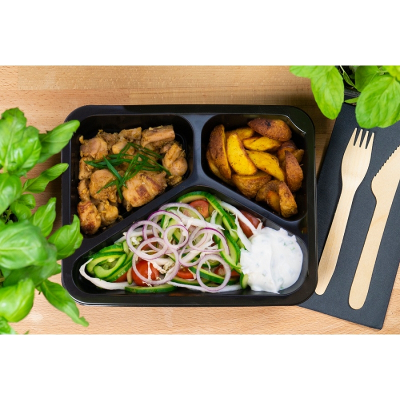 Składniki: Ziemniaczki małe z oregano 37% (potatki 98%, olej rzepakowy 1,6%, oregano 0,2%, pieprz czarny 0,1%, sól 0,1%, czosnek 0,1%), Mięso gyros 36,9% (udka z kurczaka 97,9%, olej rzepakowy 1,6%, papryka słodka 0,1%, pieprz czarny 0,1%, sól 0,1%, czosnek 0,1%, przyprawa gyros (sól, papryka słodka, czosnek, cukier, nasiona kolendry, GORCZYCA biała, majeranek, rozmaryn, owoc jałowca, cebula, chili, kurkuma, ziele angielskie, goździk, bazylia, cząber, pieprz czarny, natka pietruszki) 0,1%), Sałatka 18% (kapusta pekińska 43,4%, ogórek 28,6%, cebula 15,5%, pomidorki cherry 12,4%), Sos czosnkowy 7,4% (jogurt grecki /z MLEKA/ 88%, majonez (olej rzepakowy, olej SOJOWY, ocet spirytusowy, żółtko JAJA, przyprawy (GORCZYCA), sól, regulator kwasowości: kwas cytrynowy, naturalny aromat, sól wapniowo-disodowa EDTA) 10%, czosnek 1%, pieprz czarny 0,5%, sól 0,5%), Szczypiorek 0,7%.